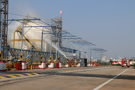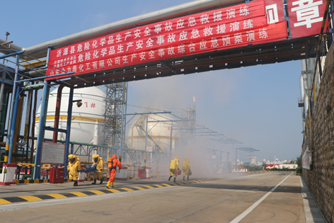 根據(jù)公司2021年(nián)“安全生產月”活動安排,6月22日上午,公司在液氨球罐(guàn)區組織開展了2021年度生產安全事故綜合應急救援(yuán)演練活動。縣應急管(guǎn)理局副局長(zhǎng)陳傳亮、開發(fā)區安環局副局長(zhǎng)苗海波(bō)以及我公(gōng)司100餘名員工觀摩了演練。 本次演練模擬的事故情景為公司(sī)2#液氨球罐出(chū)口閥前管線發生泄漏,1名巡檢人員中毒摔倒,事故影響到15萬噸硝酸生產裝置及(jí)周(zhōu)邊人員生命安全,需要緊急救援。現場調度員(yuán)接到報警後立即指揮現場人員開啟球罐噴淋,緊急切斷生產(chǎn)裝置,並(bìng)將(jiāng)事故情況報告給公司應急救(jiù)援指揮部。公司應急(jí)救(jiù)援指揮(huī)部根據(jù)事故(gù)情況啟動(dòng)了公司綜合應急救援預案,組(zǔ)織搶險救援(yuán)組、醫療救(jiù)護組、治安警戒組、環境(jìng)檢(jiǎn)測組等應急人員到達事故現場進行緊急救援。經過各組人員的共(gòng)同努力,成功堵住了液氨泄漏源、中毒人員脫離了生命危險,最後對事(shì)故現場區域空氣(qì)質量檢測合格(gé)後,現場指揮部決定解除緊急狀態,恢複生產,公司2021年度生產安全事故綜合(hé)應急救援演練圓滿完(wán)成。