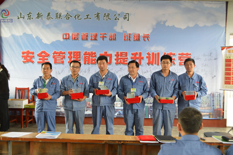 為提高公司中層管理人員的安全管理能力,新泰公司邀請建大安全(quán)技術有限公司的相關老師來公司進行安全管理專題(tí)培訓。建大安全技術(shù)有限公司根據新泰公司管理現狀采用谘詢式安全培訓的方式,主要對中層管理人員安全意識及觀念轉變進行培訓強化,著重培養化工生產中科學的安全管理思維模式,經過建大公司兩個多月的培訓,新泰(tài)公司中層管理人員的安(ān)全(quán)管理技能提(tí)升(shēng)明顯,組織、協調及激勵員工的能(néng)力有所提高,提升了中層(céng)管理人員整體綜合管理素質。5月29日新泰公司“中層管理幹部安全管理能力提升訓練營(yíng)”培訓圓滿結束,評選優(yōu)秀學員7名,優秀團隊1個。(圖(tú)為:訓練營頒獎現場)