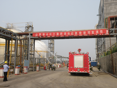 為檢驗公司危險化學品事故狀態(tài)應急(jí)處置能力,加強對重大危險源的管理,防止危化品泄漏造成火災、爆炸、傷亡以及環境汙(wū)染事故發生,公司於628日上午在東廠區液氨罐區舉行了液氨泄漏應急救援演(yǎn)練。縣政府領導、縣安監局、環保局、消防大隊、衛生局、縣(xiàn)內其他危化品企業和公司領導及部分員工觀摩了本次(cì)演習。演練現場模(mó)擬東部生產區(qū)液氨罐區1000立方米液氨球罐出口管線(xiàn)突然發(fā)生液氨泄漏,按照公司(sī)《生產安(ān)全事故綜合應急救援預(yù)案》要求,公司實施了應急救援全過程演練。